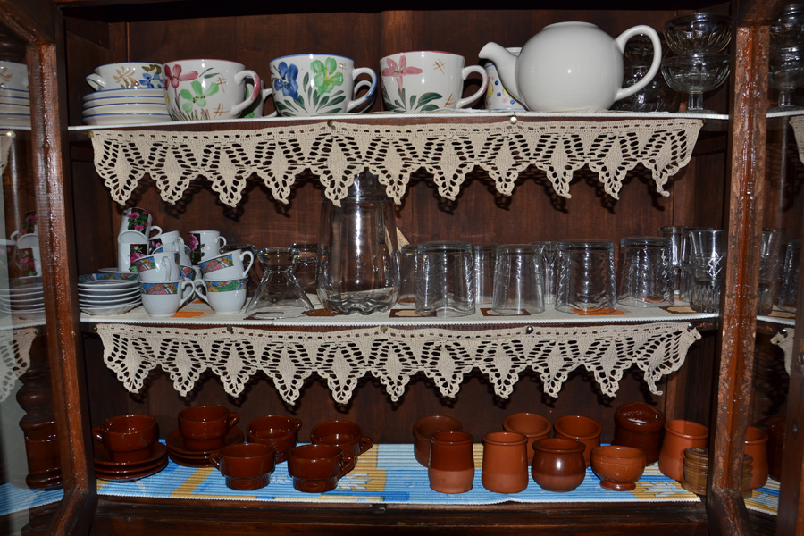 Vitrina rústica acristalada, con un cajoncito en la parte inferior, repleta de tazas, platillos, jarra, tetera… decorada con una puntilla de hilo, para conservar el estilo rústico de la casa.