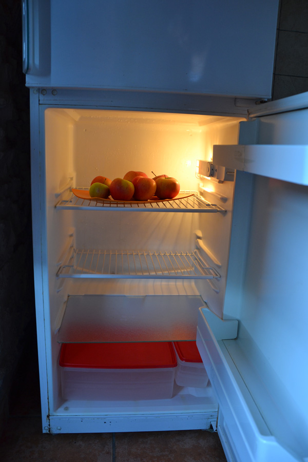 Chimenea avivada, con mesa de salón con manzanas de temporada para recibir al cliente a su llegada (en otoño-invierno).